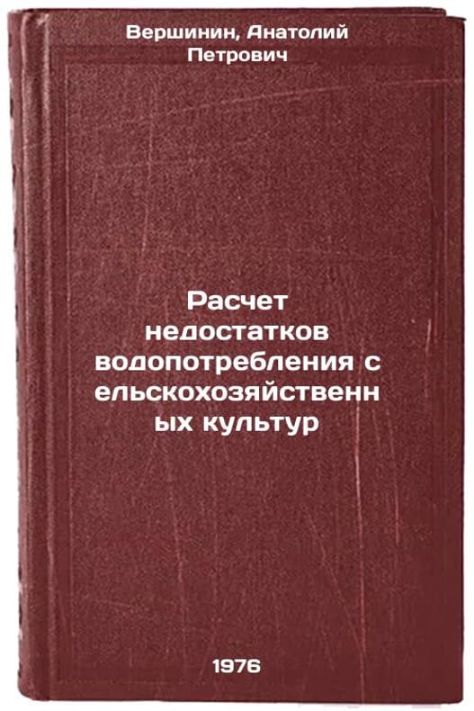 In Russian. Vershinin, Anatoly Petrovich. Calculation of water consumption deficiencies of agricultural crops. Leningrad: Hydrometeo-izdat, 1976. Raschet nedostatkov vodopotrebleniya sel'skokhozyaystvennykh kul'tur. In Russian /Calculating crop water use deficiencies . All images are for identification of editions only. Several books of the same edition may be available. Please feel free to request photos of available books. SKU7665274