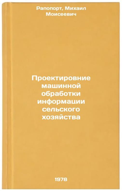 In Russian. Rapoport, Mikhail Moiseevich. Designing Machine Processing of Agricultural Information. Moscow: Statistics, 1978 Proektirovnie mashinnoy obrabotki informatsii selskogo khozyaystva/Agricultural Information Machinery Design In Russian. All images are for identification of editions only. Several books of the same edition may be available. Please feel free to request photos of available books. SKU7667997