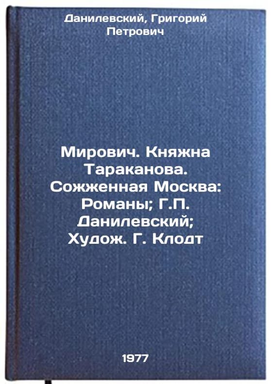 "In Russian. Danilevsky, Grigory Petrovich. Mirovich. Princess Tarakanova. Burned Moscow: Novels; G.P. Danilevsky; [Artist G. Claudt]. Moscow: Art Lit., 1977. Mirovich. Knyazhna Tarakanova. Sozhzhennaya Moskva: Romany; G.P. Danilevskiy; Khudozh. G. Klodt. In Russian /Mirovich. Princess Tarakanova. Burned Moscow: Novels; G.P. Danilevsky; Artist G. Claudt . All images are for identification of editions only. Several books of the same edition may be available. Please feel free to request photos of available books. SKU7669591"