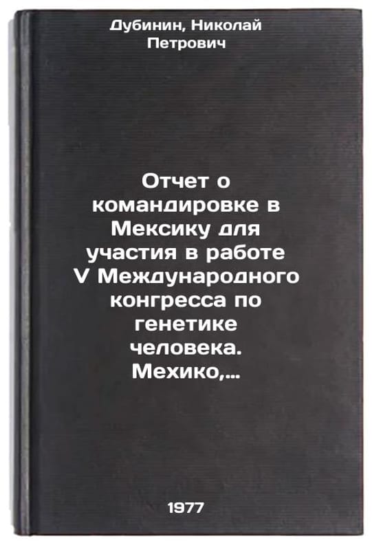 In Russian. Dubinin, Nikolai Petrovich. Report on a mission to Mexico [to participate in the V International Congress on Human Genetics. Mexico City, 10-15 October 1976]. Moscow: 1977. Otchet o komandirovke v Meksiku dlya uchastiya v rabote V Mezhdunarodnogo kongressa po genetike cheloveka. Mekhiko, 10-15 okt. 1976 g. In Russian /Report on a mission to Mexico to attend the V International Congress on Human Genetics. Mexico City, October 10-15, 1976 . All images are for identification of editions only. Several books of the same edition may be available. Please feel free to request photos of available books. SKU7670973