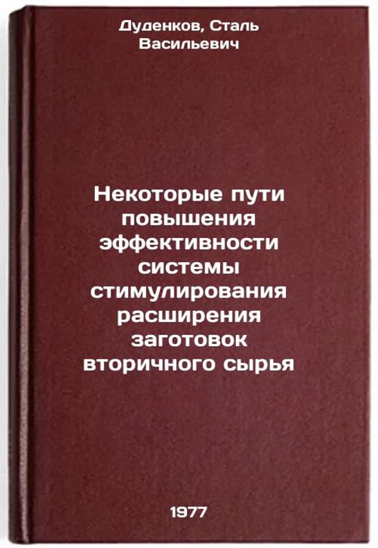 In Russian. Dudenkov, Stal Vasilievich. Some Ways to Increase the Efficiency of the System for Stimulating the Expansion of Recycling Procurements. Moscow: 1977. Nekotorye puti povysheniya effektivnosti sistemy stimulirovaniya rasshireniya zagotovok vtorichnogo syr'ya. In Russian /Some Ways to Increase the Effectiveness of the Incentive System for the Expansion of Recycling . All images are for identification of editions only. Several books of the same edition may be available. Please feel free to request photos of available books. SKU7671060