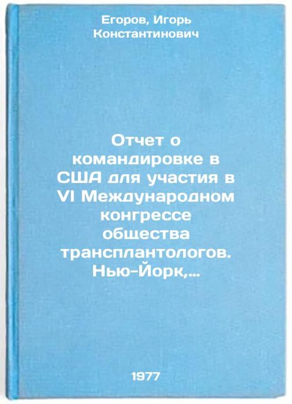 In Russian. Egorov, Igor Konstantinovich. Report on a mission to the United States [to participate in the VI International Congress of the Transplantation Society. New York, 22-28 August 1976]. Moscow: 1977. Otchet o komandirovke v SShA dlya uchastiya v VI Mezhdunarodnom kongresse obshchestva transplantologov. N'yu-York, 22-28 avgusta 1976 g. In Russian /Report on his trip to the United States to participate in the VI International Congress of the Transplantation Society. New York, 22-28 August 1976 . All images are for identification of editions only. Several books of the same edition may be available. Please feel free to request photos of available books. SKU7671351