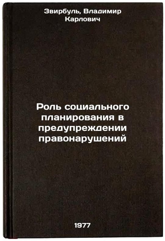 In Russian. Zvirbul, Vladimir Karlovich. The Role of Social Planning in Crime Prevention. Moscow: Knowledge, 1977. Rol' sotsial'nogo planirovaniya v preduprezhdenii pravonarusheniy. In Russian /The role of social planning in crime prevention . All images are for identification of editions only. Several books of the same edition may be available. Please feel free to request photos of available books. SKU7672743