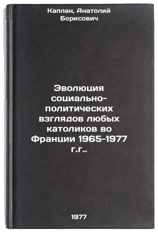 In Russian. Kaplan, Anatoly Borisovich. Evolution of the Socio-Political Attitudes of All Catholics in France 1965-1977. Moscow: 1977. Evolyutsiya sotsial'no-politicheskikh vzglyadov lyubykh katolikov vo Frantsii 1965-1977 gg. In Russian /Evolution of the Socio-Political Attitudes of All Catholics in France 1965-1977 . All images are for identification of editions only. Several books of the same edition may be available. Please feel free to request photos of available books. SKU7675008