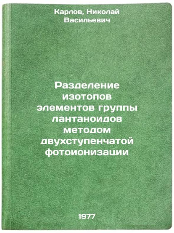 In Russian. Karlov, Nikolai Vasilievich. Isotope separation of elements of the lanthanoid group by means of two-stage photoionization. Moscow: 1977. Razdelenie izotopov elementov gruppy lantanoidov metodom dvukhstupenchatoy fotoionizatsii. In Russian /Isotope separation of lanthanoid group elements by two-stage photoionization . All images are for identification of editions only. Several books of the same edition may be available. Please feel free to request photos of available books. SKU7675141