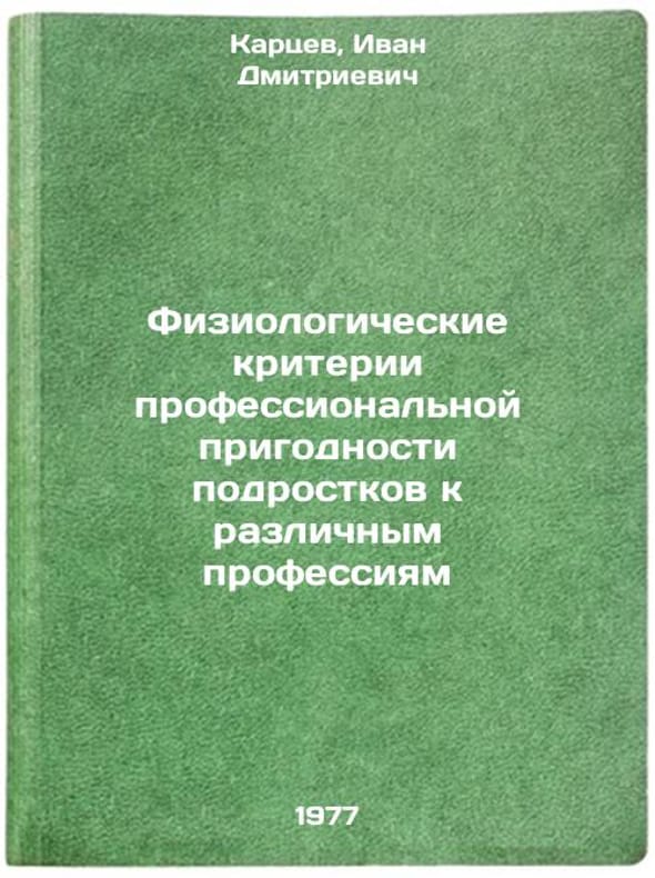 In Russian. Kartsev, Ivan Dmitrievich. Physiological criteria for the professional fitness of adolescents for various professions. Moscow: Medicine, 1977. Fiziologicheskie kriterii professional'noy prigodnosti podrostkov k razlichnym professiyam. In Russian /Physiological criteria for the vocational suitability of adolescents for various occupations . All images are for identification of editions only. Several books of the same edition may be available. Please feel free to request photos of available books. SKU7675250