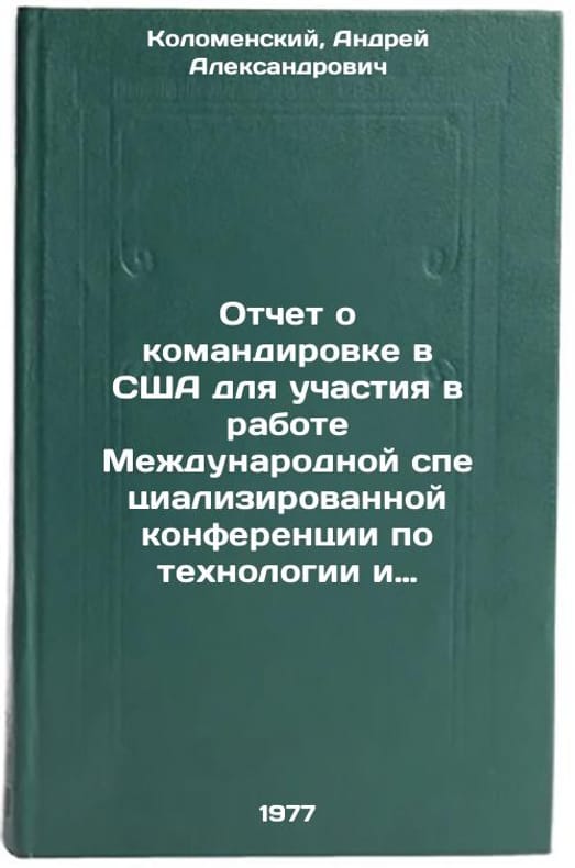 In Russian. Kolomensky, Andrey Alexandrovich. Report on a mission to the United States [to participate in the International Specialized Conference on High-Speed Electronic Beams Technology and Research (Applications). Albuquerque, November 3-6, 1975]. Moscow: 1977. Otchet o komandirovke v SShA dlya uchastiya v rabote Mezhdunarodnoy spetsializirovannoy konferentsii po tekhnologii i issledovaniyam (primeneniyam) sil'notochnykh elektronnykh puchkov. Al'bukerk. 3-6 noyabrya 1975 g. In Russian /Report on a mission to the United States to attend the International Specialized Conference on High-Speed Electronic Beams Technology and Research (Applications). Albuquerque, November 3-6, 1975 . All images are for identification of editions only. Several books of the same edition may be available. Please feel free to request photos of available books. SKU7677603