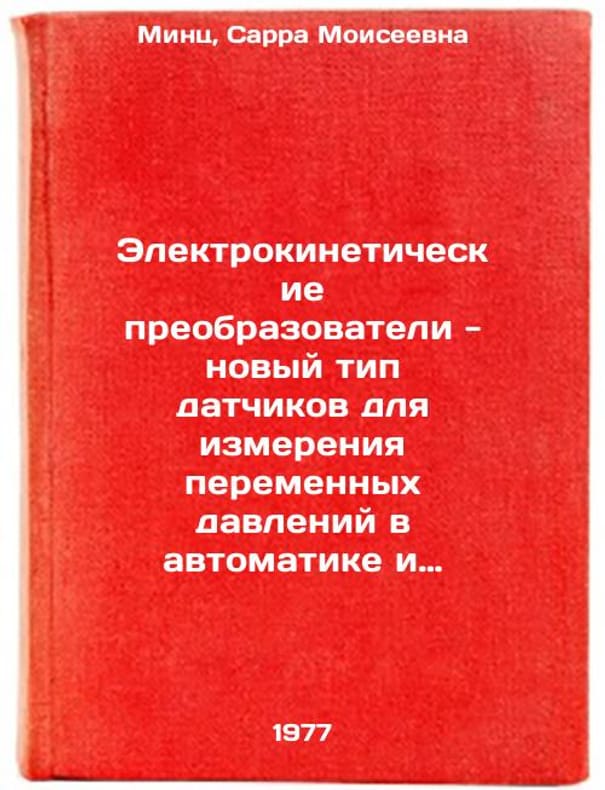 In Russian. Mints, Sarra Moiseevna. Electrokinetic converters - a new type of sensors for measuring variable pressures in automation and measuring technology. Moscow: 1977. Elektrokineticheskie preobrazovateli - novyy tip datchikov dlya izmereniya peremennykh davleniy v avtomatike i izmeritel'noy tekhnike. In Russian /Electrokinetic converters - a new type of sensor for measuring variable pressures in automation and measuring technology . All images are for identification of editions only. Several books of the same edition may be available. Please feel free to request photos of available books. SKU7681669