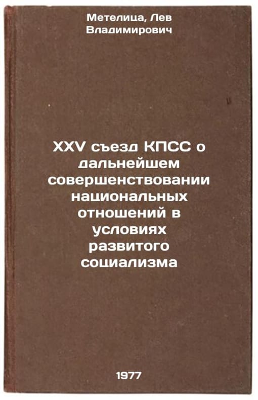 In Russian. Metelitsa, Lev Vladimirovich. XXV Congress of the CPSU on the Further Improvement of National Relations in the Conditions of Developed Socialism. XXV sezd KPSS o dal'neyshem sovershenstvovanii natsional'nykh otnosheniy v usloviyakh razvitogo sotsializma. In Russian /XXV Congress of the CPSU on the Further Improvement of National Relations in the Conditions of Developed Socialism . All images are for identification of editions only. Several books of the same edition may be available. Please feel free to request photos of available books. SKU7682283