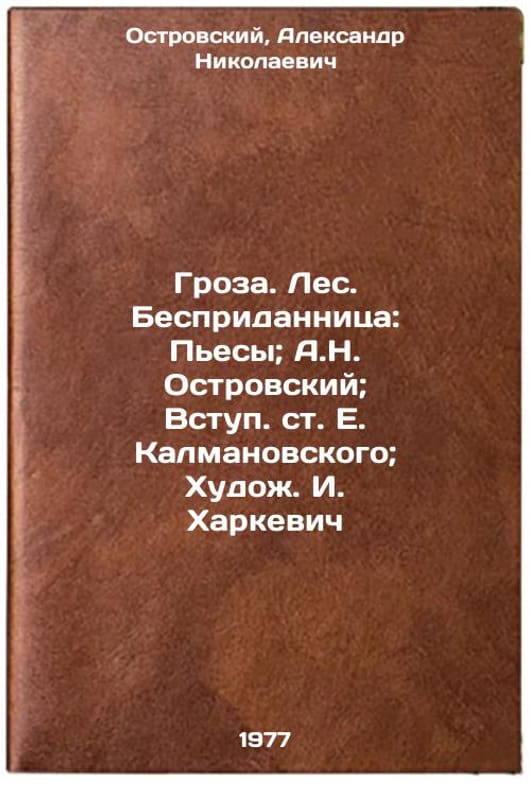 "In Russian. Ostrovsky, Alexander Nikolaevich. Thunderstorm. Forest. Without a dowry: [Plays]; A.N. Ostrovsky; [Entry by E. Kalmanovsky; Artist. I. Kharkevich]. Leningrad: Painter's Lit. Leningrad Division, 1977. Groza. Les. Bespridannitsa: P'esy; A.N. Ostrovskiy; Vstup. st. E. Kalmanovskogo; Khudozh. I. Kharkevich. In Russian /Thunderstorm. Forest. No dowry: Plays; A.N. Ostrovsky; Entry by E. Kalmanovsky; Artist. I. Kharkevich . All images are for identification of editions only. Several books of the same edition may be available. Please feel free to request photos of available books. SKU7688941"