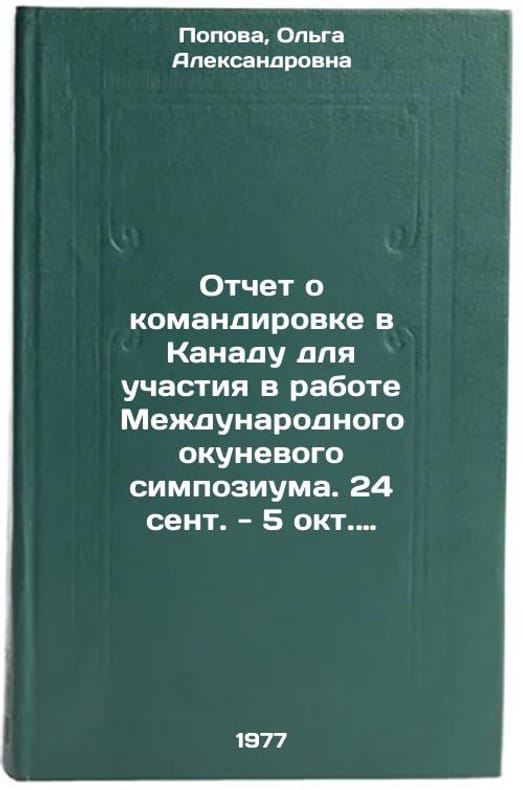 In Russian. Popova, Olga Alexandrovna. Report on a mission to Canada [to participate in the International Perch Symposium. September 24 - October 5, 1976]. Moscow: 1977. Otchet o komandirovke v Kanadu dlya uchastiya v rabote Mezhdunarodnogo okunevogo simpoziuma. 24 sent. - 5 okt. 1976 g. In Russian /Report on a mission to Canada to attend the International Perch Symposium. 24 Sep. - 5 Oct. 1976 . All images are for identification of editions only. Several books of the same edition may be available. Please feel free to request photos of available books. SKU7689912