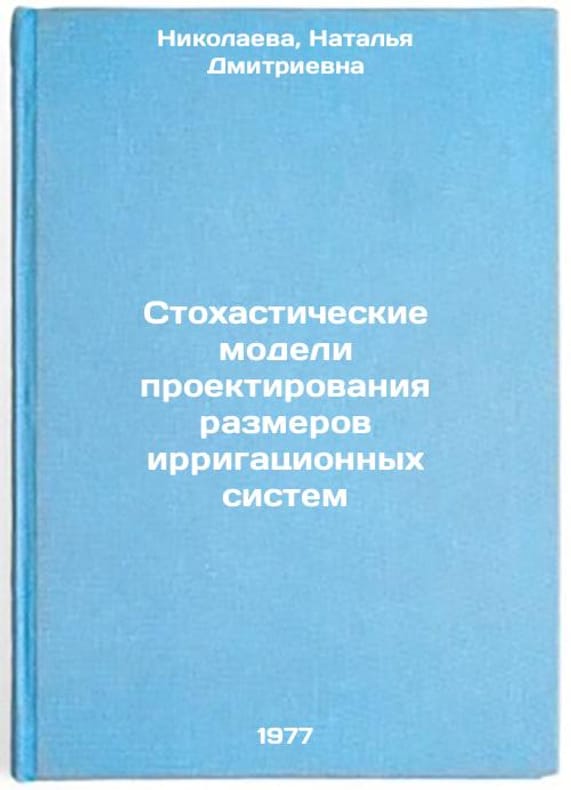 In Russian. Nikolaeva, Natalya Dmitrievna. Stochastic models of designing the dimensions of irrigation systems. Moscow: 1977. Stokhasticheskie modeli proektirovaniya razmerov irrigatsionnykh sistem. In Russian /Stochastic models for designing the size of irrigation systems . All images are for identification of editions only. Several books of the same edition may be available. Please feel free to request photos of available books. SKU7691519