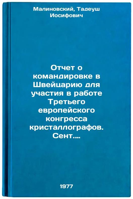 In Russian. Malinowski, Tadeusz Iosifovich. Report on a mission to Switzerland [to attend the Third European Congress of Crystallographers. September 1976]. Moscow: 1977. Otchet o komandirovke v Shveytsariyu dlya uchastiya v rabote Tret'ego evropeyskogo kongressa kristallografov. Sent. 1976 g. In Russian /Report on a mission to Switzerland to attend the Third European Congress of Crystallographers. September 1976 . All images are for identification of editions only. Several books of the same edition may be available. Please feel free to request photos of available books. SKU7693268