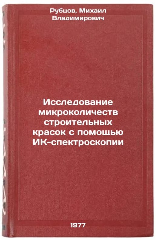 In Russian. Rubtsov, Mikhail Vladimirovich. Investigation of microquantities of building paints using infrared spectroscopy. Moscow: 1977. Issledovanie mikrokolichestv stroitel'nykh krasok s pomoshch'yu IK-spektroskopii. In Russian /Investigation of microquantities of building paints using infrared spectroscopy . All images are for identification of editions only. Several books of the same edition may be available. Please feel free to request photos of available books. SKU7693388