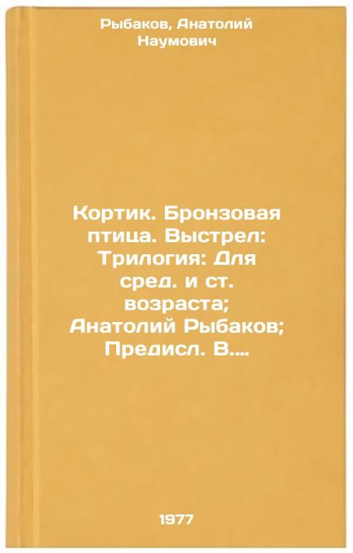 "In Russian. Rybakov, Anatoly Naumovich. Kortik. Bronze bird. Shot: Trilogy: [For middle and senior years]; Anatoly Rybakov; [Predisl. V. Smirnova; Ric. R. Volsky]. Moscow: Det. lit., 1977. Kortik. Bronzovaya ptitsa. Vystrel: Trilogiya: Dlya sred. i st. vozrasta; Anatoliy Rybakov; Predisl. V. Smirnovoy; Ris. R. Vol'skogo. In Russian /Kortik. Bronze bird. Shot: Trilogy: For middle and upper ages; Anatoly Rybakov; Predisl. V. Smirnova; Ric. R. Volsky . All images are for identification of editions only. Several books of the same edition may be available. Please feel free to request photos of available books. SKU7693740"
