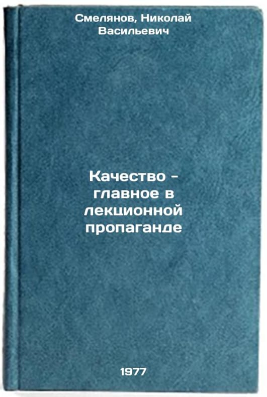 In Russian. Smelyanov, Nikolai Vasilievich. Quality is the main thing in lecture propaganda. Moscow: O-vo Znanie RSFSR, 1977. Kachestvo - glavnoe v lektsionnoy propagande. In Russian /Quality is paramount in lecture propaganda . All images are for identification of editions only. Several books of the same edition may be available. Please feel free to request photos of available books. SKU7695876