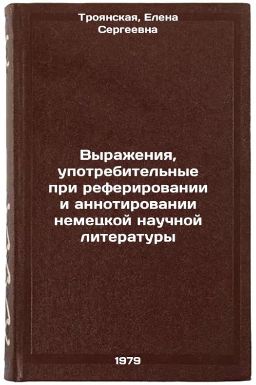 In Russian. Troyanskaya, Elena Sergeevna. Expressions used in abstraction and annotation of German scientific literature. Moscow: 1978 (vol. 1979) Vyrazheniya, upotrebitelnye pri referirovanii i annotirovanii nemetskoy nauchnoy literatury/Expressions used in abstractions and annotations of German scientific literature In Russian. All images are for identification of editions only. Several books of the same edition may be available. Please feel free to request photos of available books. SKU8418333