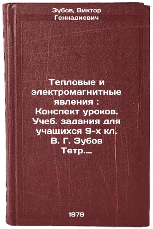 In Russian. Zubov, Viktor Gennadievich. Thermal and Electromagnetic Phenomena: Lessons Summary. Textbooks for Pupils of the 9th Kl. / V. G. Zubov Teter. 6. M.: Laboratory of Teaching Physics at the Research Institute of Content and Methods of Teaching, 1980. Teplovye i elektromagnitnye yavleniya: Konspekt urokov. Ucheb. zadaniya dlya uchashchikhsya 9-go kl. V. G. Zubov Tetr. 6. In Russian /Thermal and Electromagnetic Phenomena: Lessons Outline. Textbooks for Pupils of the 9th Kl. V. G. Zubov Ter. 6 . All images are for identification of editions only. Several books of the same edition may be available. Please feel free to request photos of available books. SKU999133