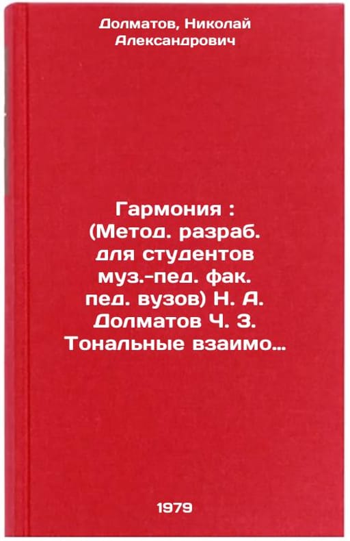 In Russian. Dolmatov, Nikolai Aleksandrovich. Harmony: (Methodological development for students of pedagogical education) N. A. Dolmatov Ch. 3. Tonal interconnections and full functional system of non-dissonant harmonies Garmoniya: (Metod. razrab. dlya studentov muz.-ped. fak. ped. vuzov) N. A. Dolmatov Ch. 3. Tonalnye vzaimo svyazi i polnaya funktsionalnaya sistema nedissoniruyushchikh garmoniy. Faktura./Harmony: (Methodological development for students of pedagogical education) N. A. Dolmatov Ch. 3. Tonal interconnections and full functional system of non-dissonant harmonies In Russian. All images are for identification of editions only. Several books of the same edition may be available. Please feel free to request photos of available books. SKU998369