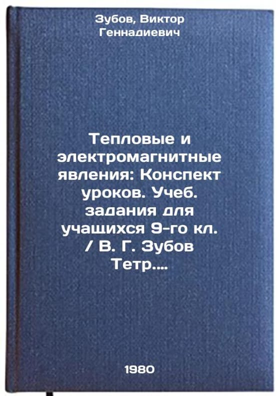 In Russian. Zubov, Viktor Gennadievich. Thermal and Electromagnetic Phenomena: Lessons Summary. Textbooks for Pupils of the 9th Kl. / V. G. Zubov Teter. 6. M.: Laboratory of Teaching Physics at the Research Institute of Content and Methods of Teaching, 1980. Teplovye i elektromagnitnye yavleniya: Konspekt urokov. Ucheb. zadaniya dlya uchashchikhsya 9-go kl. V. G. Zubov Tetr. 6. In Russian /Thermal and Electromagnetic Phenomena: Lessons Outline. Textbooks for Pupils of the 9th Kl. V. G. Zubov Ter. 6 . All images are for identification of editions only. Several books of the same edition may be available. Please feel free to request photos of available books. SKU999133