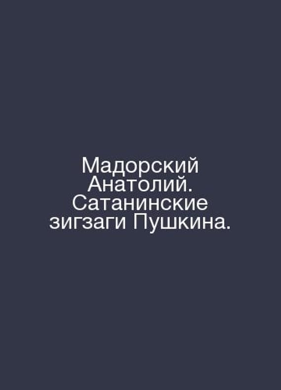 Madorsky Anatoly. Pushkins Satanic zigzags. In Russian /Madorskiy Anatoliy. Sataninskie zigzagi Pushkina. Moscow: Pomatur, 1998. 352Contact us for details or to request photos of available books. Delivery of this book could take longer than normal due to additional handling time before shipping, and no rush delivery options are available. Please let us know if you have a specific date by which you need to receive your order.SKUalb01c878544fe8c4f0