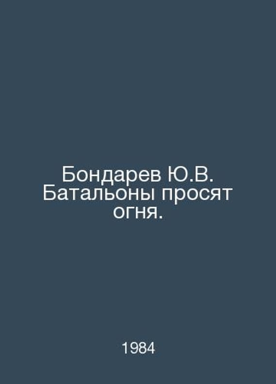 Bondaryev Yu.V. Battalions ask for fire. In Russian /Bondarev Yu.V. Batalony prosyat ognya. M. Sovremennik 1984.Contact us for details or to request photos of available books. Delivery of this book could take longer than normal due to additional handling time before shipping, and no rush delivery options are available. Please let us know if you have a specific date by which you need to receive your order.SKUalb02042fd4f8fc487f