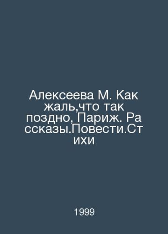 Alexeyeva M. How sorry it is that it is so late, Paris In Russian /Alekseeva M. Kak zhal,chto tak pozdno, Parizh. Rasskazy.Povesti.Stikhi Circulation of 800 copies of St. Petersburg Pushkin Fund 1999.Contact us for details or to request photos of available books. Delivery of this book could take longer than normal due to additional handling time before shipping, and no rush delivery options are available. Please let us know if you have a specific date by which you need to receive your order.SKUalb021a52adeaefdfc7