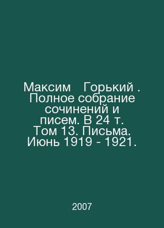 Maxim Gorky. Complete collection of essays and letters. Volume 24, Volume 13. Letters. June 1919 - 1921. In Russian /Maksim†Gorkiy. Polnoe sobranie sochineniy i pisem. V 24 t. Tom 13. Pisma. Iyun 1919 - 1921. Redkol F. Kuznetsov (Head of Editorial Board) et al., Russian Academy of Sciences, A.M. Gorky Institute of World Literature. Moscow Science 2007. Contact us for details or to request photos of available books. Delivery of this book could take longer than normal due to additional handling time before shipping, and no rush delivery options are available. Please let us know if you have a specific date by which you need to receive your order. SKUalb02c447a3e292340c