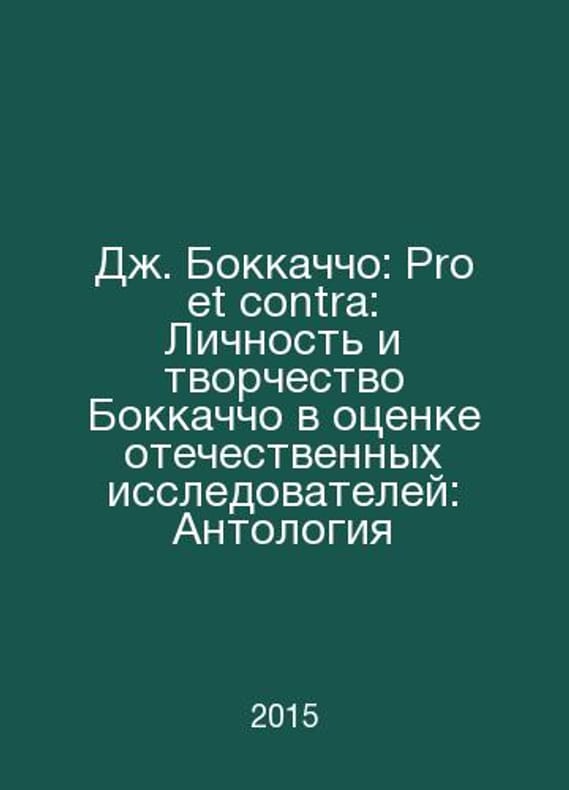 J. Boccaccio: Pro et contra: The Personality and Creativity of Boccaccio in the Evaluation of Domestic Researchers: Anthology In Russian /Dzh. Bokkachcho: Pro et contra: Lichnost i tvorchestvo Bokkachcho v otsenke otechestvennykh issledovateley: Antologiya Series: The Russian Way St. Petersburg RHCA 2015..Contact us for details or to request photos of available books. Delivery of this book could take longer than normal due to additional handling time before shipping, and no rush delivery options are available. Please let us know if you have a specific date by which you need to receive your order. SKUalb02cad3ab236a7332