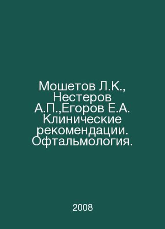 Moshetov L.K., Nesterov A., Egorov E.A. Clinical recommendations. Ophthalmology. In Russian /Moshetov L.K., Nesterov A.,Egorov E.A. Klinicheskie rekomendatsii. Oftalmologiya. M. Gaotar-Media year 2008.. Contact us for details or to request photos of available books. SKUalb02cba0b54ae2fd98.