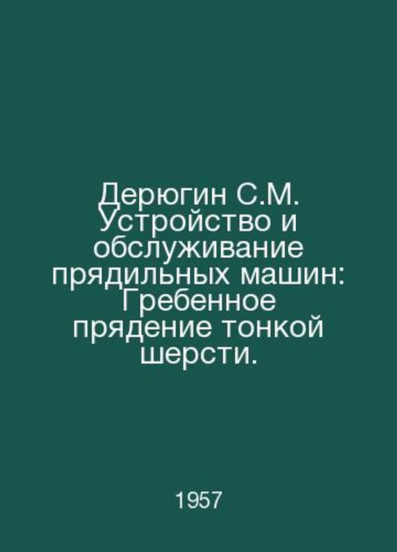 Deryugin S.M. Construction and maintenance of spinning machines: Thin wool spinning. In Russian /Deryugin S.M. Ustroystvo i obsluzhivanie pryadilnykh mashin: Grebennoe pryadenie tonkoy shersti. M. Gizlegprom 1957.. Contact us for details or to request photos of available books. SKUalb0398ba1b5cda538e.