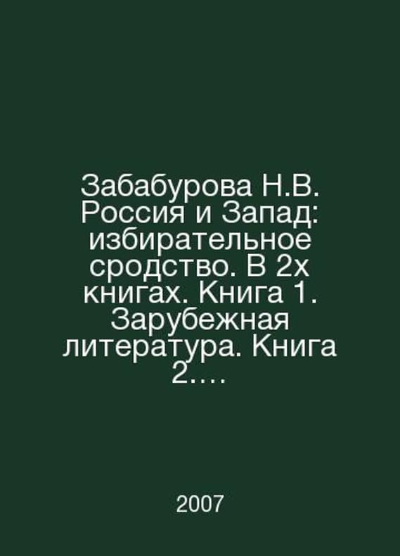 Zaburova N.V. Russia and the West: selective affinity. In two books. Book 1. Foreign Literature. Book 2. Pushkin and around him In Russian /Zababurova N.V. Rossiya i Zapad: izbiratelnoe srodstvo. V 2kh knigakh. Kniga 1. Zarubezhnaya literatura. Kniga 2. Pushkin i vokrug nego Rostov-on-Don Logos 2007. Contact us for details or to request photos of available books. Delivery of this book could take longer than normal due to additional handling time before shipping, and no rush delivery options are available. Please let us know if you have a specific date by which you need to receive your order. SKUalb04f30d19aa7543a6