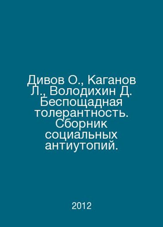 Divov O., Kaganov L., Volodykhin D. Ruthless Tolerance. A collection of social dystopias. In Russian /Divov O., Kaganov L., Volodikhin D. Besposhchadnaya tolerantnost. Sbornik sotsialnykh antiutopiy. Russian fiction series. Moscow: Eksmo 2012 year. Contact us for details or to request photos of available books. Delivery of this book could take longer than normal due to additional handling time before shipping, and no rush delivery options are available. Please let us know if you have a specific date by which you need to receive your order.SKUalb05d13271ce79daff