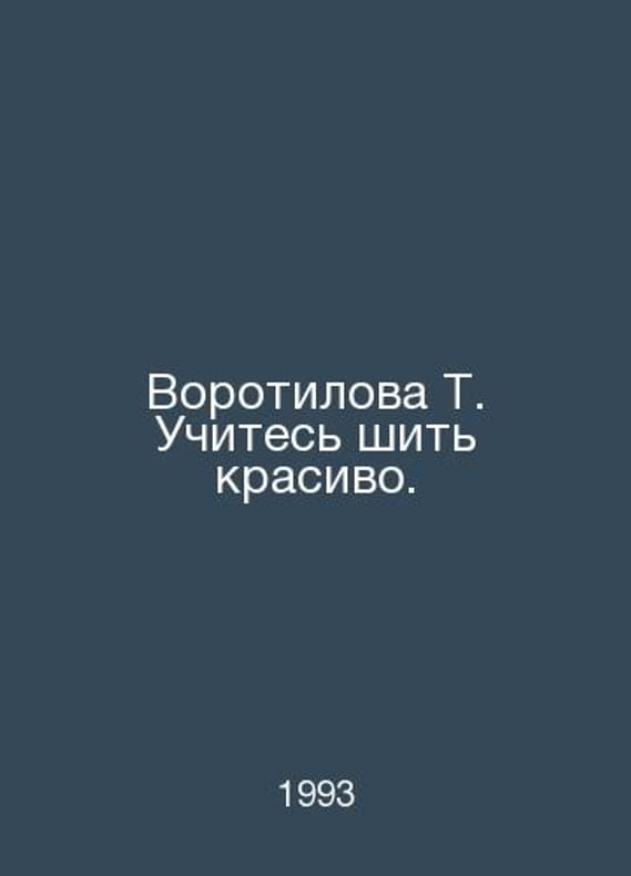 T. Vorotilova Learn to sew beautifully. In Russian /Vorotilova T. Uchites shit krasivo. M 1993. Contact us for details or to request photos of available books. Delivery of this book could take longer than normal due to additional handling time before shipping, and no rush delivery options are available. Please let us know if you have a specific date by which you need to receive your order.SKUalb07ab39cb79a79067