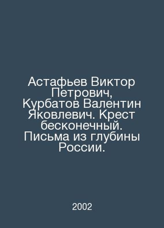Astafyev Viktor Petrovich, Kurbatov Valentin Yakovlevich. The cross is infinite. Letters from the depths of Russia. In Russian /Astafev Viktor Petrovich, Kurbatov Valentin Yakovlevich. Krest beskonechnyy. Pisma iz glubiny Rossii. Compilation, Preface by G. Sapronov. Postscript by L. Anninsky Irkutsk Publisher Sapronov 2002. Contact us for details or to request photos of available books. Delivery of this book could take longer than normal due to additional handling time before shipping, and no rush delivery options are available. Please let us know if you have a specific date by which you need to receive your order. SKUalb08d0b3cd623ab44f