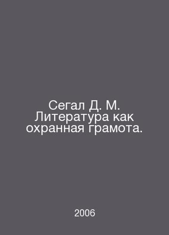 Segal D. M. Literature as a Certificate of Protection. In Russian /Segal D. M. Literatura kak okhrannaya gramota. Moscow Aquarius 2006.Contact us for details or to request photos of available books. Delivery of this book could take longer than normal due to additional handling time before shipping, and no rush delivery options are available. Please let us know if you have a specific date by which you need to receive your order.SKUalb09f2e311f06d6d0c
