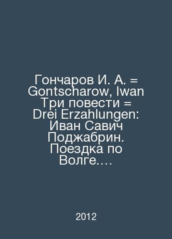 Goncharov I. A. Gontscarow, Iwan Three Stories Drei Erzahlungen: Ivan Savic Podzhabrin. Ride the Volga. The servants of the old age In Russian /Goncharov I. A. Gontscharow, Iwan Tri povesti Drei Erzahlungen: Ivan Savich Podzhabrin. Poezdka po Volge. Slugi starogo veka In Russian and German Language: Rev. Yu. G. Friedstein: Design by E. V. Karpov Moscow Rudomino Book Center 2012. Contact us for details or to request photos of available books. Delivery of this book could take longer than normal due to additional handling time before shipping, and no rush delivery options are available. Please let us know if you have a specific date by which you need to receive your order.SKUalb0b0e08923a07cb2b