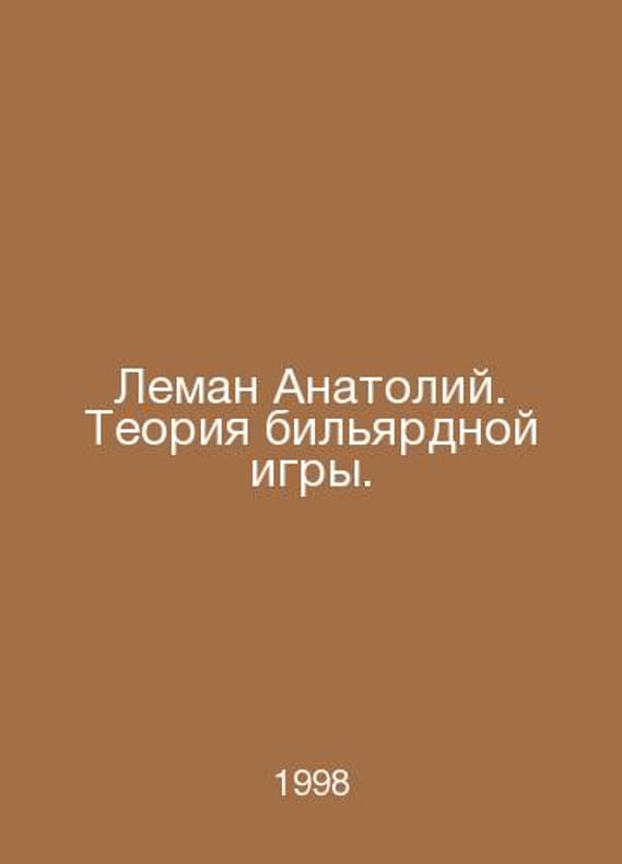 Lehman Anatoly. Theory of the pool game. In Russian /Leman Anatoliy. Teoriya bilyardnoy igry. With drawings and drawings. M. Terra. Sport. 1998.Contact us for details or to request photos of available books. Delivery of this book could take longer than normal due to additional handling time before shipping, and no rush delivery options are available. Please let us know if you have a specific date by which you need to receive your order.SKUalb0b2211e449e879df