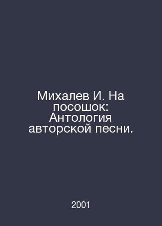 Mikhalev I. On a stick: The anthology of the authors song. In Russian /Mikhalev I. Na pososhok: Antologiya avtorskoy pesni. M Goodyal Press 2001. Contact us for details or to request photos of available books. Delivery of this book could take longer than normal due to additional handling time before shipping, and no rush delivery options are available. Please let us know if you have a specific date by which you need to receive your order.SKUalb0c80b8ce3af2d132