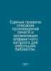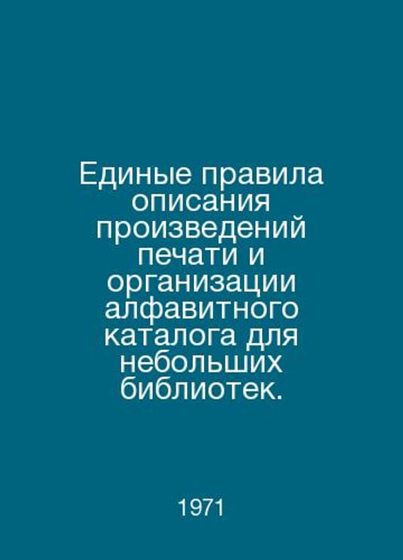 Uniform rules for describing print works and organizing an alphabet catalogue for small libraries. In Russian /Edinye pravila opisaniya proizvedeniy pechati i organizatsii alfavitnogo kataloga dlya nebolshikh bibliotek. 2nd edition, revised and supplemented. M. Editions of the Book. 1971.. Contact us for details or to request photos of available books. SKUalb0d32b8e85d86b467.