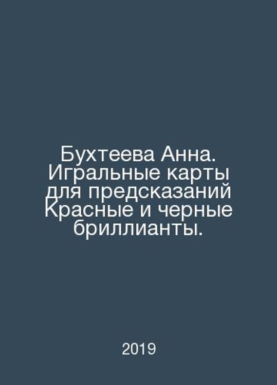Anna Bukhteeva. Playing cards for predicting red and black diamonds. In Russian /Bukhteeva Anna. Igralnye karty dlya predskazaniy Krasnye i chernye brillianty. Hn.: Magic-Kniga 2019. Contact us for details or to request photos of available books. Delivery of this book could take longer than normal due to additional handling time before shipping, and no rush delivery options are available. Please let us know if you have a specific date by which you need to receive your order. SKUalb0e30e8fb67e74c36