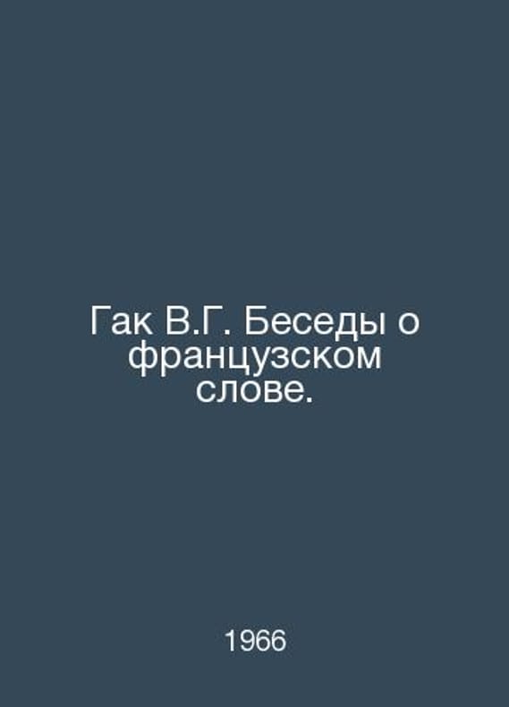 Gak VG Conversations on the French Word. In Russian /Gak V.G. Besedy o frantsuzskom slove. From the comparative lexicology of French and Russian. M. International Relations. 1966.. Contact us for details or to request photos of available books. SKUalb0e4bb37bbfc55326.