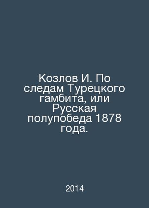 Kozlov I. Following in the footsteps of the Turkish Gambit, or Russian Semi-Victory of 1878. In Russian /Kozlov I. Po sledam Turetskogo gambita, ili Russkaya polupobeda 1878 goda. M. Eterna, 2014.Contact us for details or to request photos of available books. Delivery of this book could take longer than normal due to additional handling time before shipping, and no rush delivery options are available. Please let us know if you have a specific date by which you need to receive your order.SKUalb0e91f7f5d20facc6