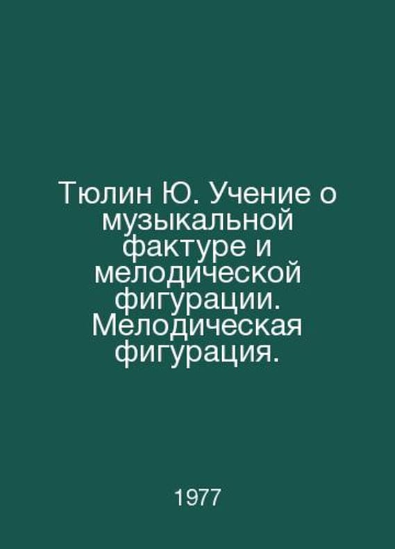 Tyulin Yu. Teaching about musical texture and melodic figure. In Russian /Tyulin Yu. Uchenie o muzykalnoy fakture i melodicheskoy figuratsii. Music Texture. M. Music 1976. You are welcome to reach out to us for a detailed description of the copies currently available. Delivery of this book may take longer than usual including extended processing and pre-shipping time, no expedited shipping is available. Please advise us if you have a set date or a deadline to receive your order.SKUalba5b0466ff1892c9e