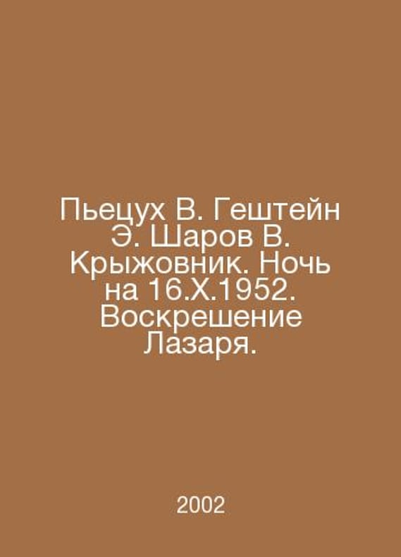 Pietsukh V. Gestein E. Sharov V. Kryzhovnik. Overnight on 16.X.1952. The Resurrection of Lazarus. In Russian /Petsukh V. Geshteyn E. Sharov V. Kryzhovnik. Noch na 16.Kh.1952. Voskreshenie Lazarya. Magazine banner # 8 2002 m truth 2002.Contact us for details or to request photos of available books. Delivery of this book could take longer than normal due to additional handling time before shipping, and no rush delivery options are available. Please let us know if you have a specific date by which you need to receive your order.SKUalb10b1b237b5b31845