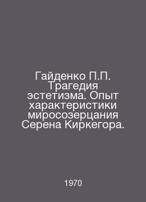 Gaidenko The Tragedy of Aesthetics. Experience in Characterizing Serena Kirkegaards World Vision. In Russian /Gaydenko Tragediya estetizma. Opyt kharakteristiki mirosozertsaniya Serena Kirkegora. M. Art. 1970.Contact us for details or to request photos of available books. Delivery of this book could take longer than normal due to additional handling time before shipping, and no rush delivery options are available. Please let us know if you have a specific date by which you need to receive your order.SKUalb1356951f8e86b038