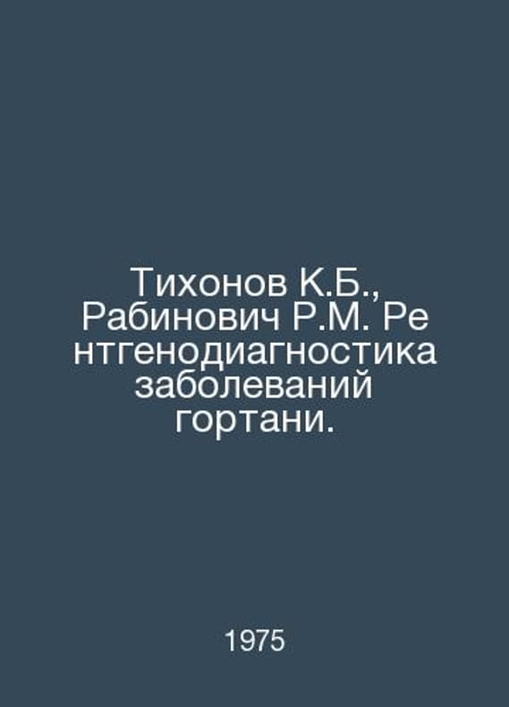 Tikhonov K.B., Rabinovich R.M. X-ray diagnosis of laryngeal diseases. In Russian /Tikhonov K.B., Rabinovich R.M. Rentgenodiagnostika zabolevaniy gortani. Series: Library of Practitioner. L. Medicine, 1975.. Contact us for details or to request photos of available books. SKUalb1403d03cc5861bf4.