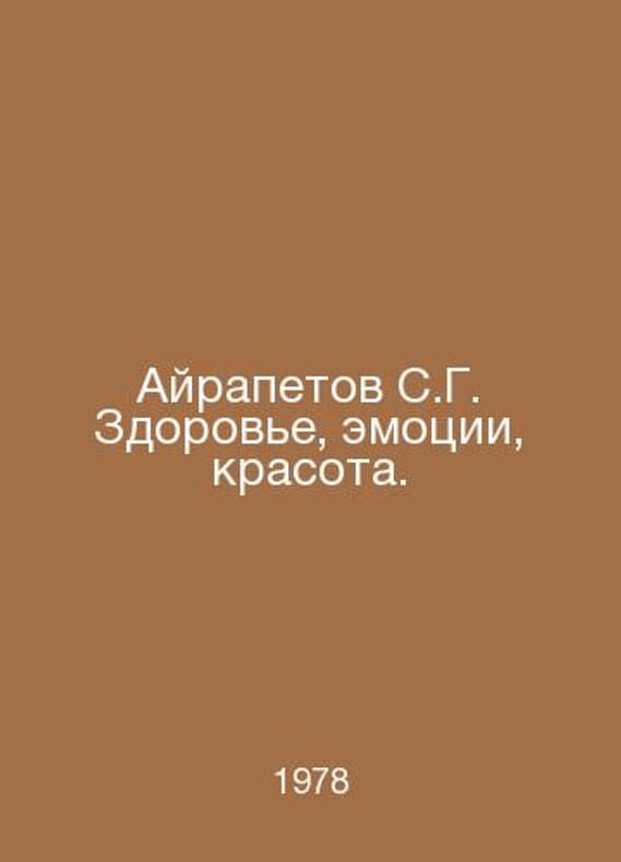 Ayrapetov S.G. Health, emotions, beauty. In Russian /Ayrapetov S.G. Zdorove, emotsii, krasota. Edition 4, amended and supplemented. Stavropol. Book Publishing House. 1978.Contact us for details or to request photos of available books. Delivery of this book could take longer than normal due to additional handling time before shipping, and no rush delivery options are available. Please let us know if you have a specific date by which you need to receive your order.SKUalb16754482c61cecc3