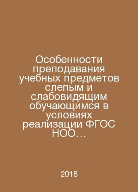Features of teaching subjects to blind and visually impaired students in the context of GEF LEO implementation of HIA: Methodological Recommendations. Part 3 In Russian /Osobennosti prepodavaniya uchebnykh predmetov slepym i slabovidyashchim obuchayushchimsya v usloviyakh realizatsii FGOS NOO OVZ: metodich.rekomendatsii. Chast 3 St. Petersburg RSPU named after A.I. Herzen 2018.Contact us for details or to request photos of available books. Delivery of this book could take longer than normal due to additional handling time before shipping, and no rush delivery options are available. Please let us know if you have a specific date by which you need to receive your order.SKUalb16f10a75c571b75e