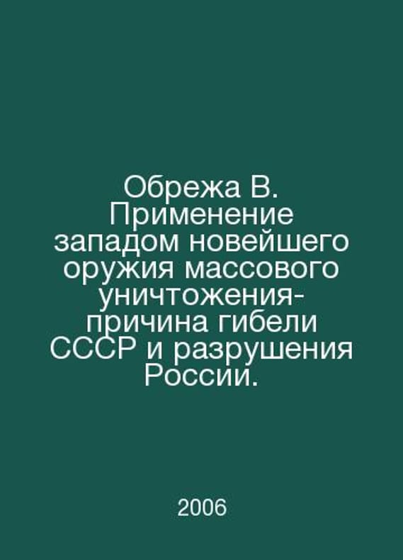 The Wests use of advanced weapons of mass destruction is the cause of the USSRs demise and the destruction of Russia. In Russian /Obrezha V. Primenenie zapadom noveyshego oruzhiya massovogo unichtozheniya-prichina gibeli SSSR i razrusheniya Rossii. Moscow OOO Publishing House AlMi 2006.Contact us for details or to request photos of available books. Delivery of this book could take longer than normal due to additional handling time before shipping, and no rush delivery options are available. Please let us know if you have a specific date by which you need to receive your order.SKUalb19e0061e0fb56a7b